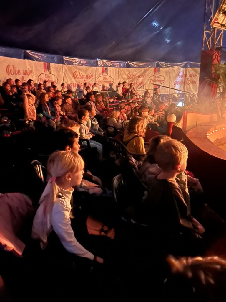 Im Zirkus erwartete uns eine ganz besondere Sondervorstellung nur für unsere Grundschule. Wir staunten über mutige Akrobaten, lachende Jongleure und sogar einen echten Feuerspucker 🔥. Es wurde gestaunt, gelacht und kräftig applaudiert.