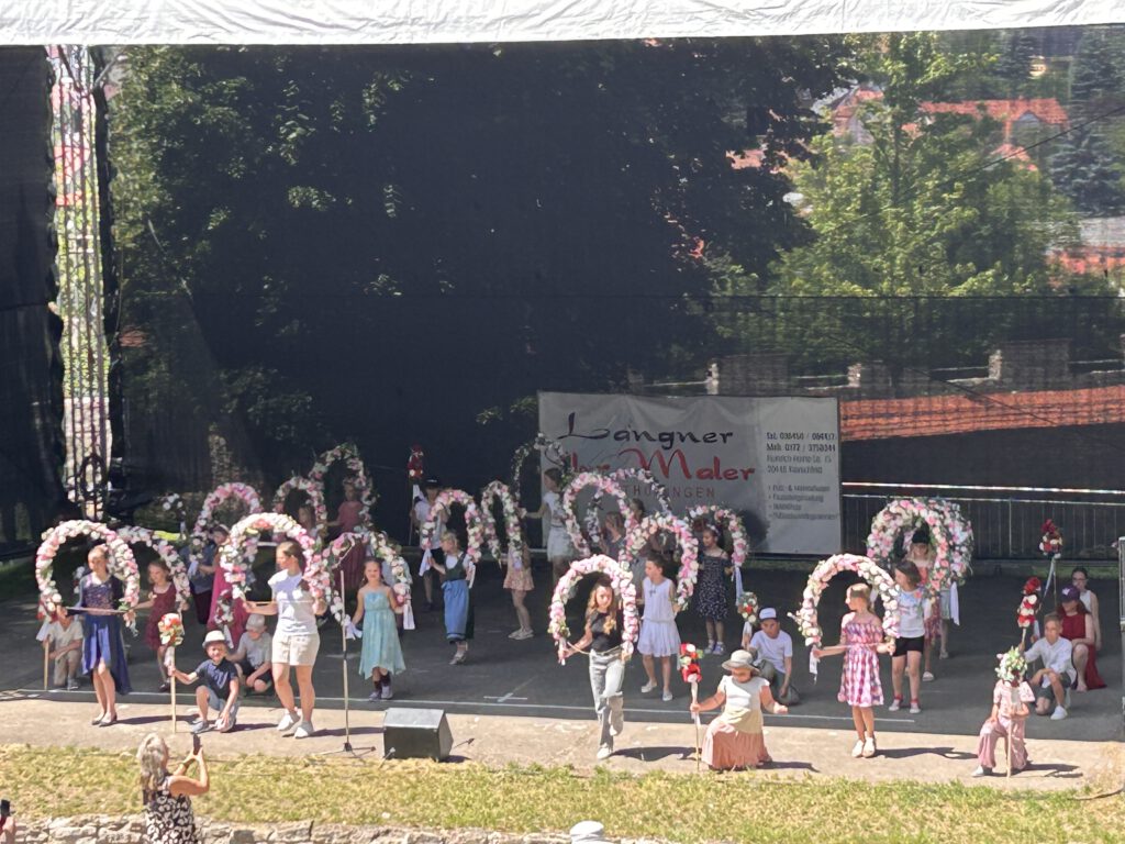 Am 14.06.2025 war es endlich soweit. Nach vielen Proben hatten unsere Grundschüler den Auftritt zum Rosenfest. Die Temperaturen könnten nicht sommerlicher sein. Da so viele Kinder mitgemacht haben durfte der Rosenreigen gleich zweimal aufgeführt werden. Gruppe Eins eröffnete das Kinderfest, Gruppe Zwei hatte die Ehre die neue Rosenkönigin auf die Bühne zu bringen und mit dem Rosenreigen zu begrüßen. Den Abschluss bildete der Showtanz, bei dem das Publikum begeistert mittanzte. Unterstützt wurden unsere „Kleinen“ von den „Großen“ der Regelschule Kranichfeld, die den Rosenreigen schon viele Jahre begleiten. Ein Herzlicher Dank an Frau Krempler, Frau Becher, Frau Märtin und die Schüler der 6. Klasse die in vielen Stunden den Tanz einübten.