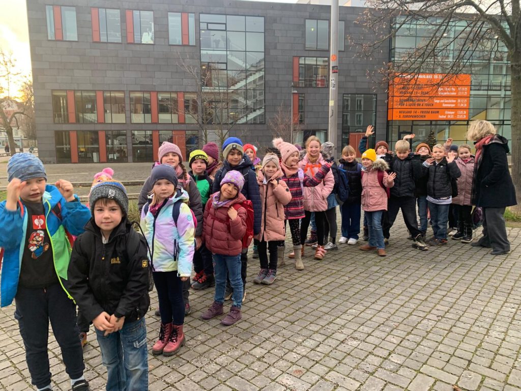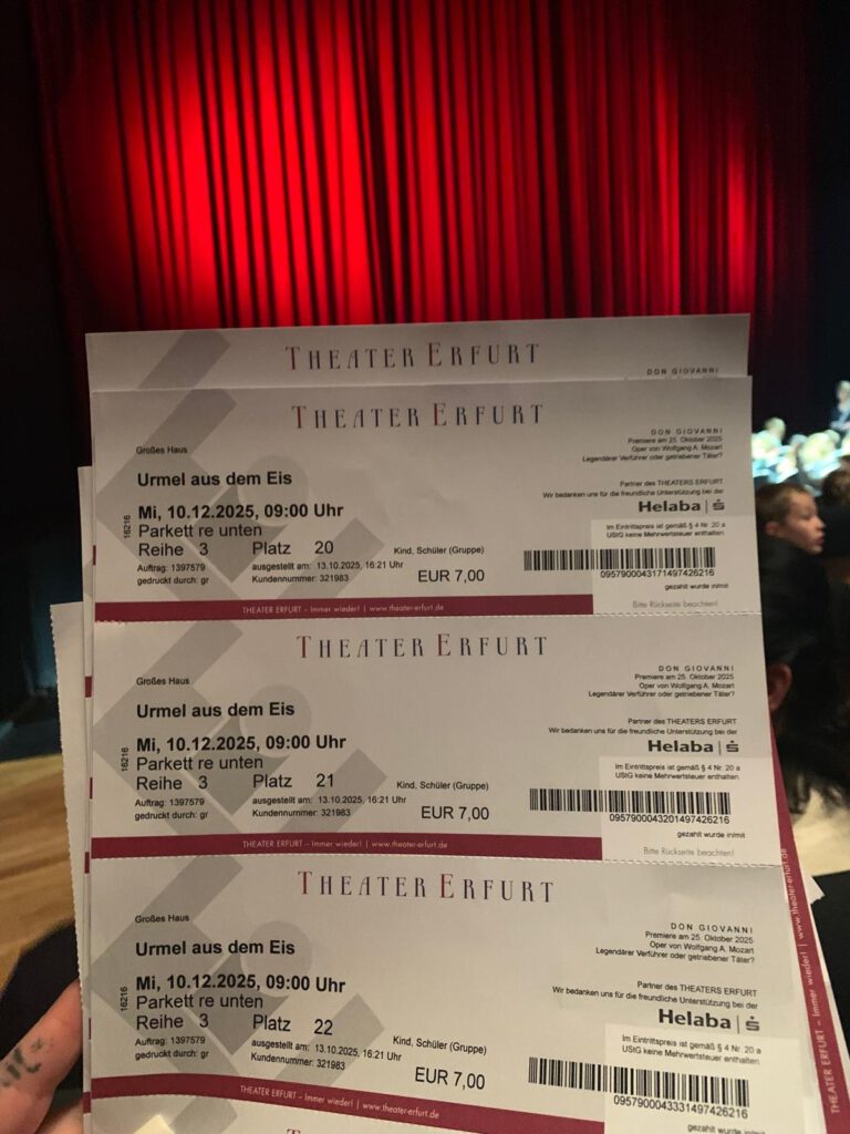Am 10.12.25 machten wir uns alle auf den Weg ins Theater Erfurt, um das Stück „Urmel aus dem Eis“ zu erleben. Schon die Busfahrt sorgte für beste Stimmung: Mit Weihnachtsliedern, Musik und Partybeleuchtung verging die Zeit wie im Flug.