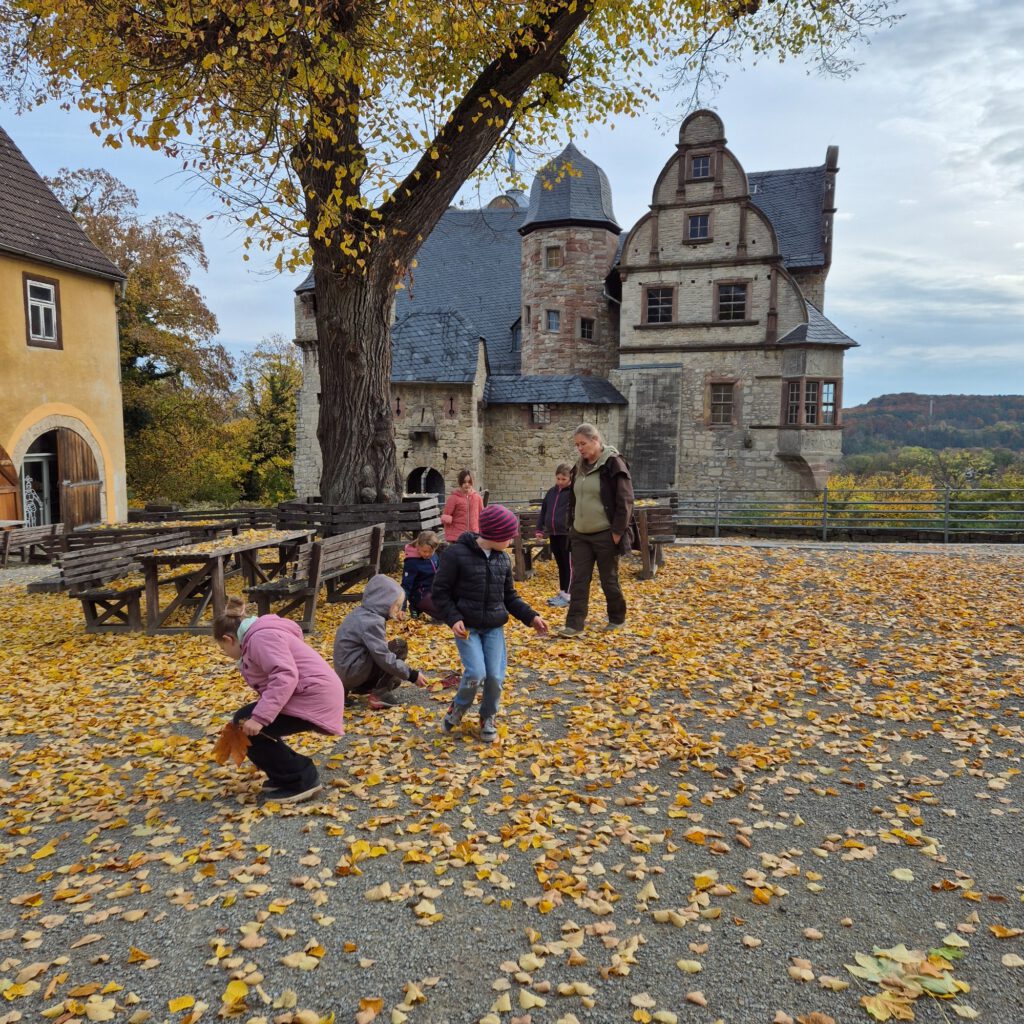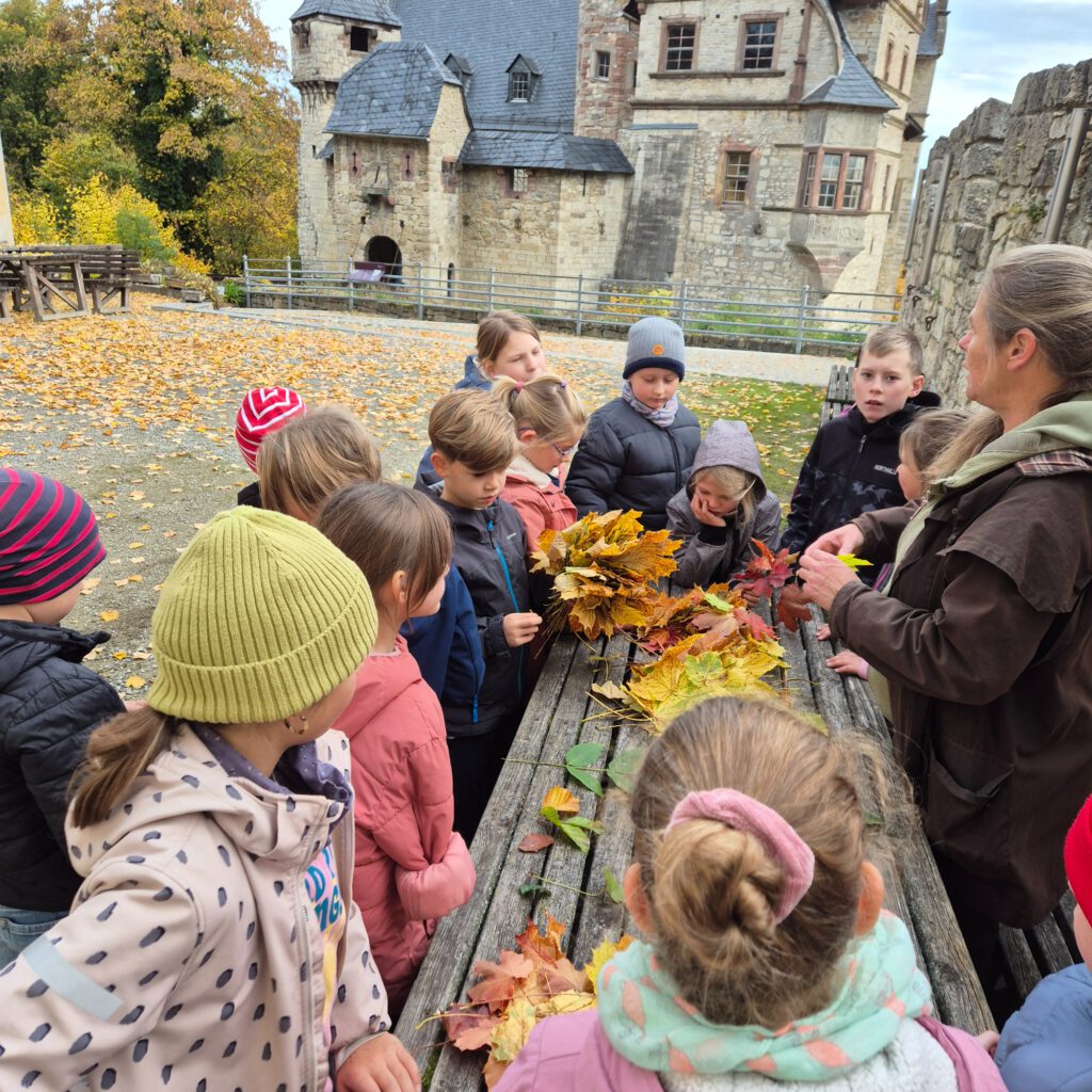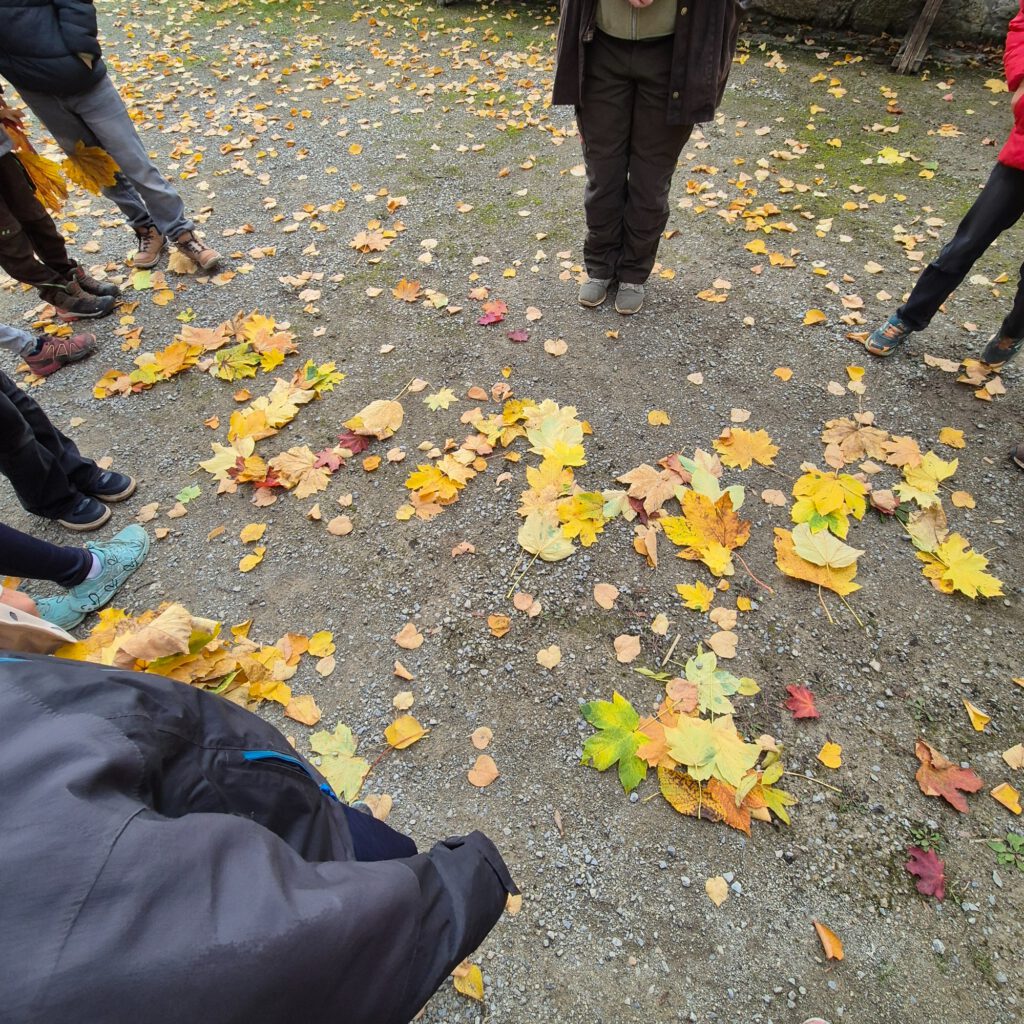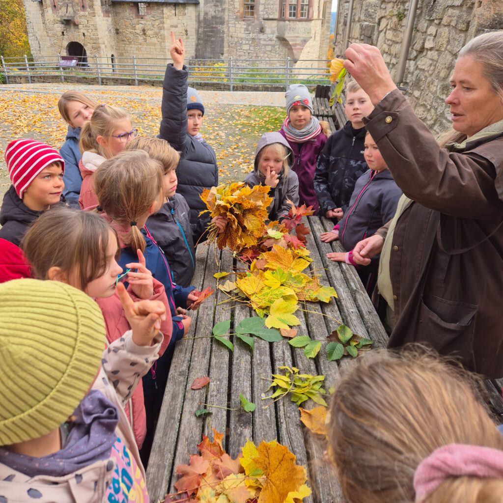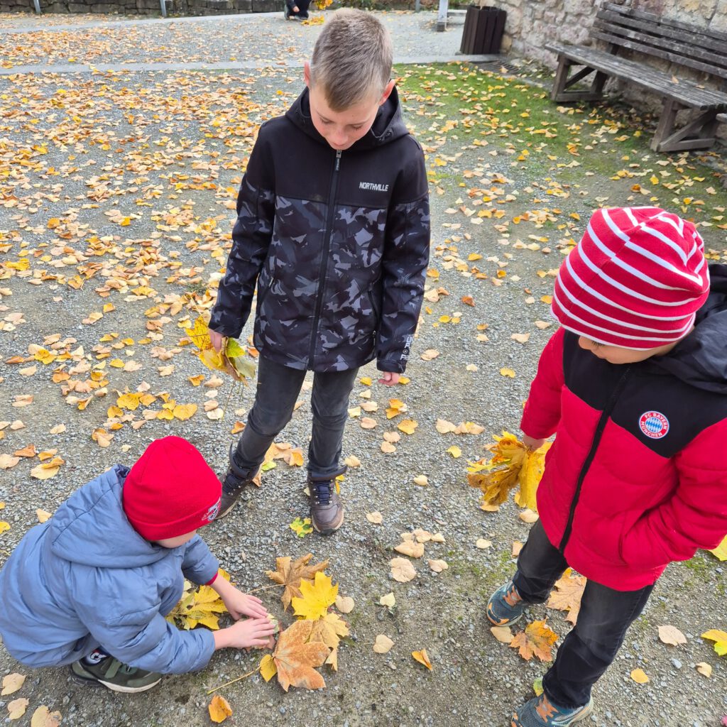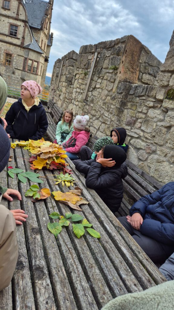 Auch der Wald rund um das Oberschloss wurde besucht, die Bäume bestimmt, Bilder aus Blättern gelegt und Früchte den Bäumen zugeordnet.