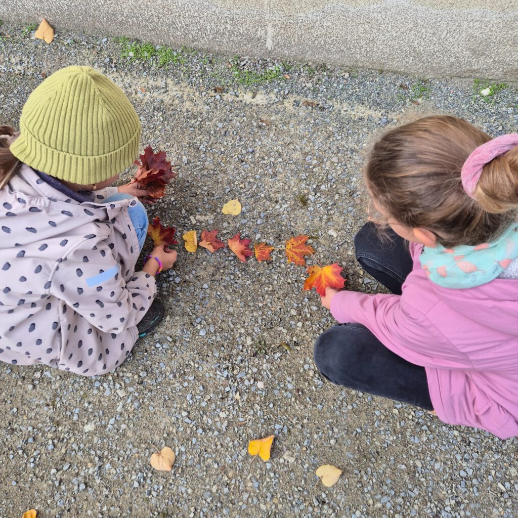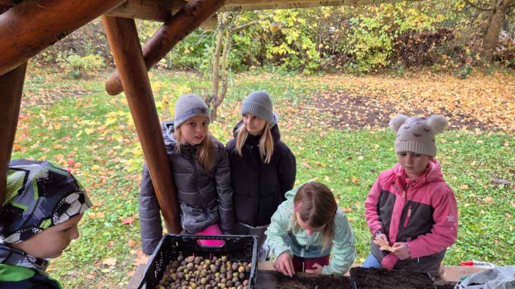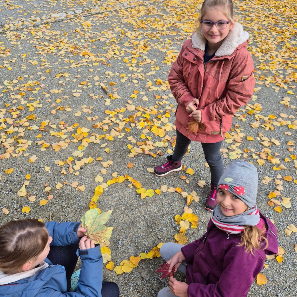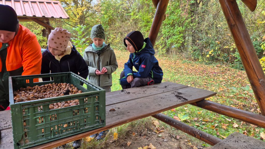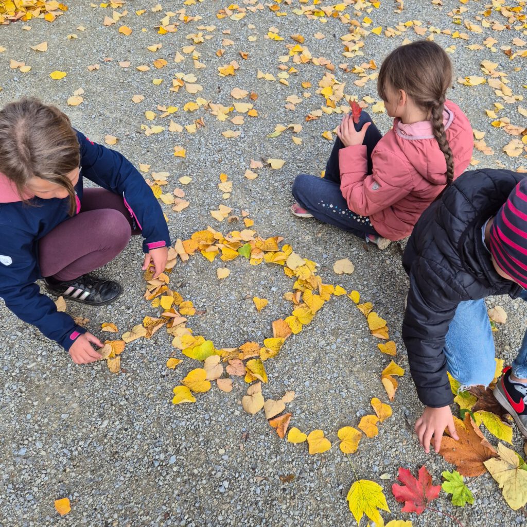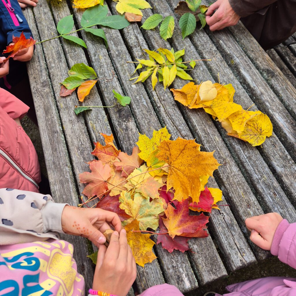 Auch der Wald rund um das Oberschloss wurde besucht, die Bäume bestimmt, Bilder aus Blättern gelegt und Früchte den Bäumen zugeordnet.