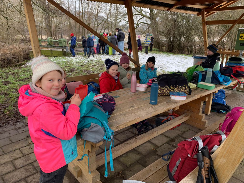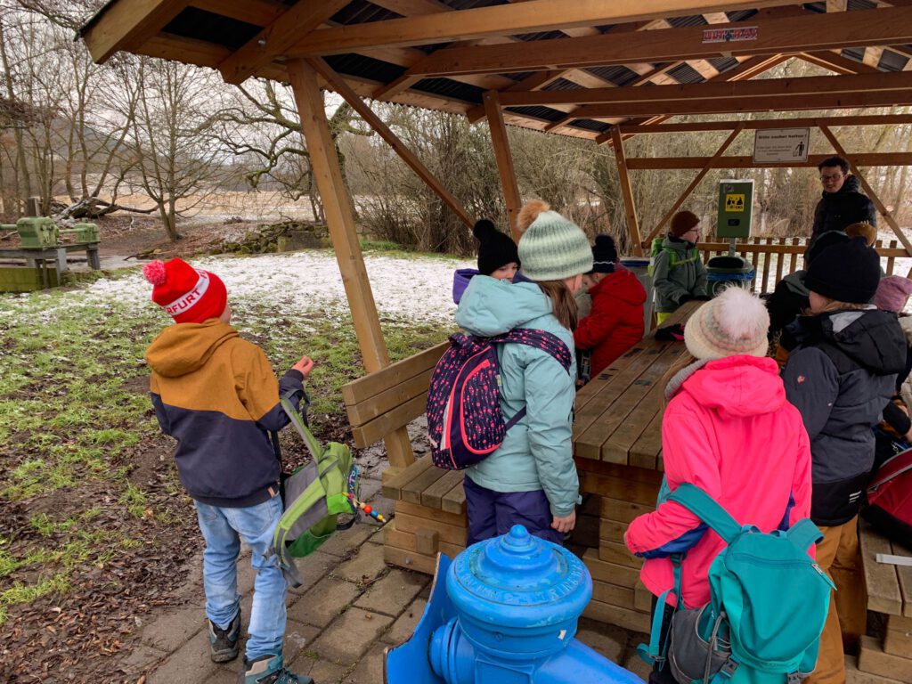 Am Wehr angekommen, staunten alle über die Kraft des Wassers. Wir sprachen darüber, warum ein Wehr gebaut wird und welche wichtige Rolle es für den Fluss und die Umgebung spielt. Natürlich blieb auch genügend Zeit für eine gemütliche Pause mit Picknick.