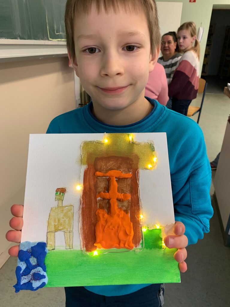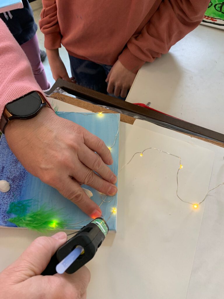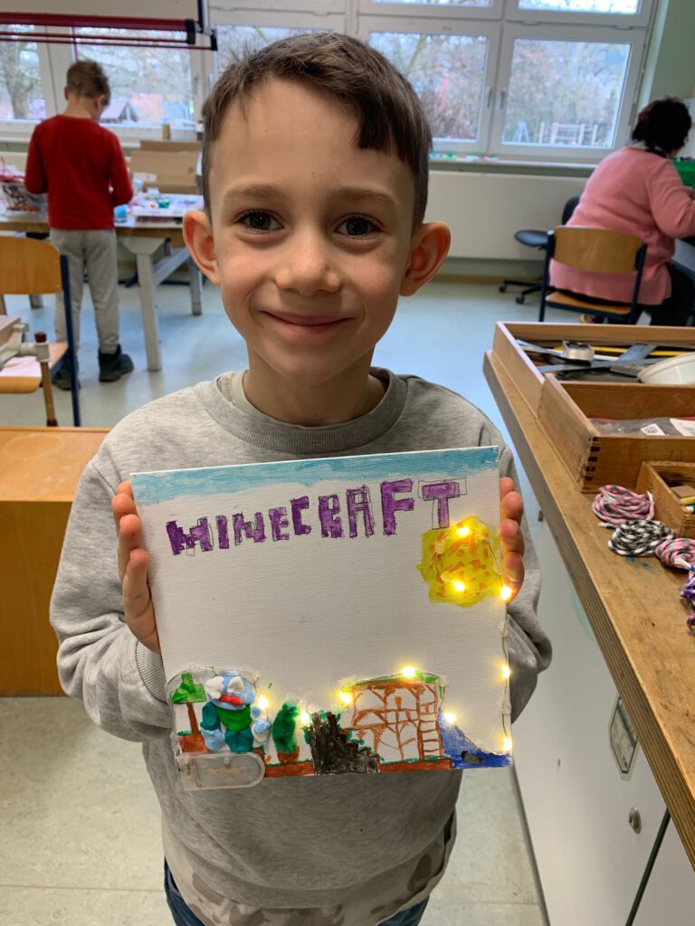 Am Kreativdonnerstag wurde es in der Ferienbetreuung besonders leuchtend und fantasievoll: Die Kinder gestalteten wunderschöne 3D-Bilder mit Lichterketten und verwandelten einfache Materialien in beeindruckende Kunstwerke.